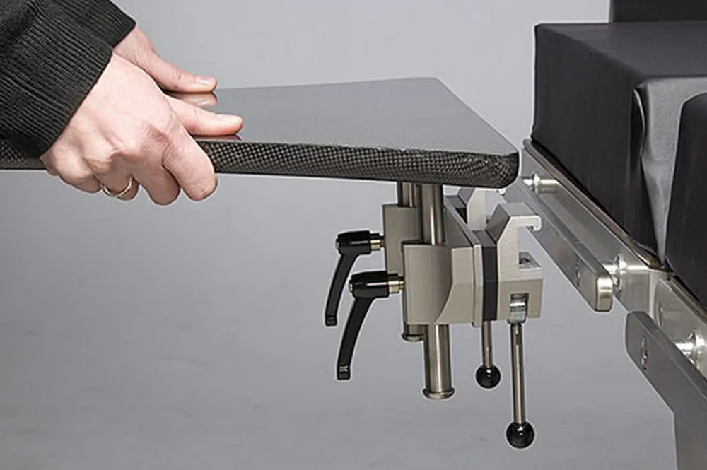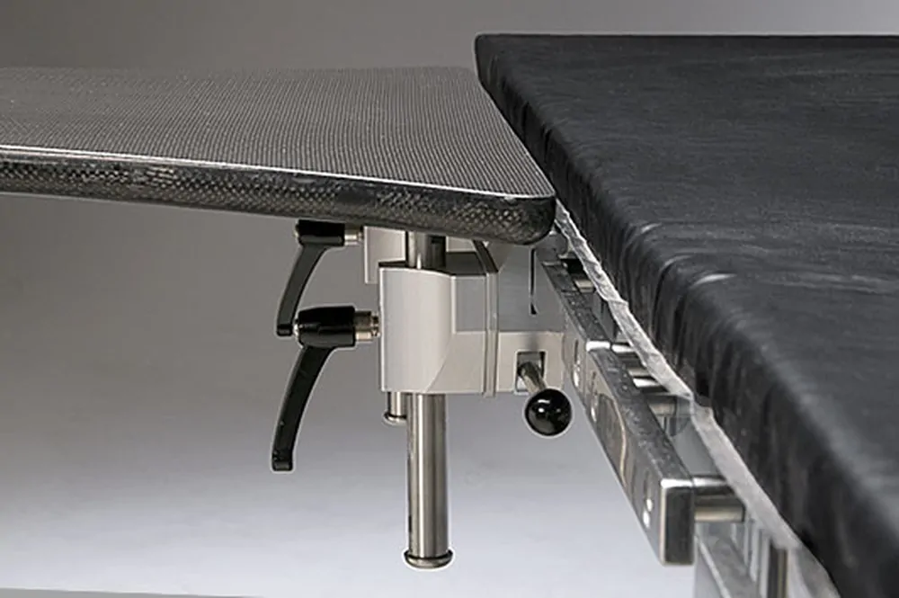 Bordet er lett og har ett støtteben i glassfiber som kan plasseres i festet på høyre eller venstre side, avhengig av plassering av kirurg vs. C-bue.